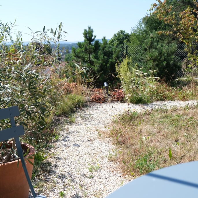 Ein wilder Naturgarten als Dachlandschaft, angelegt auf zwei Ebenen, nach den Prinzipien des Feng Shui. ...