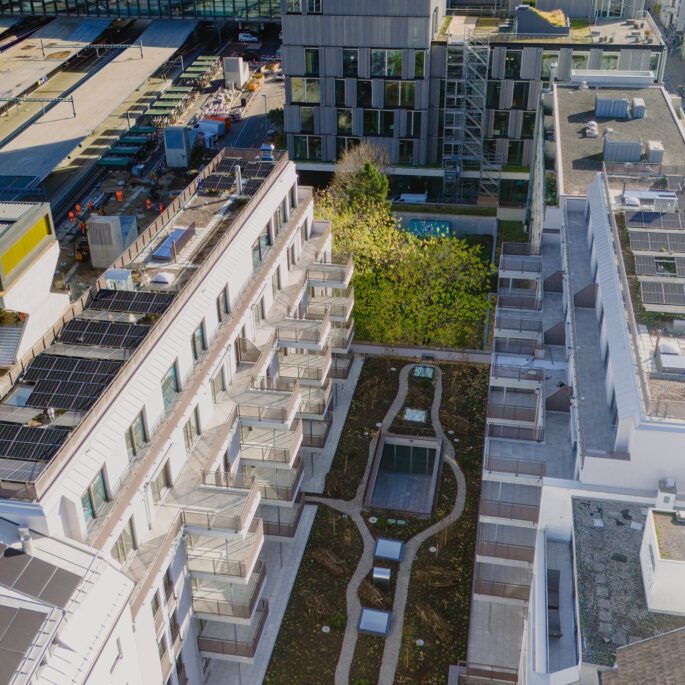 Im Basler Gundeldinger Quartier, nahe des Bahnhofs SBB, liegt über dem Erdgeschoss eines Neubaus, ein Innenhof als grüner Freiraum mit Qualitäten für Mensch und Natur. ...