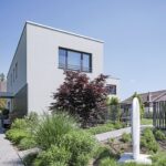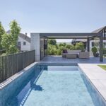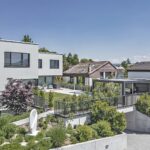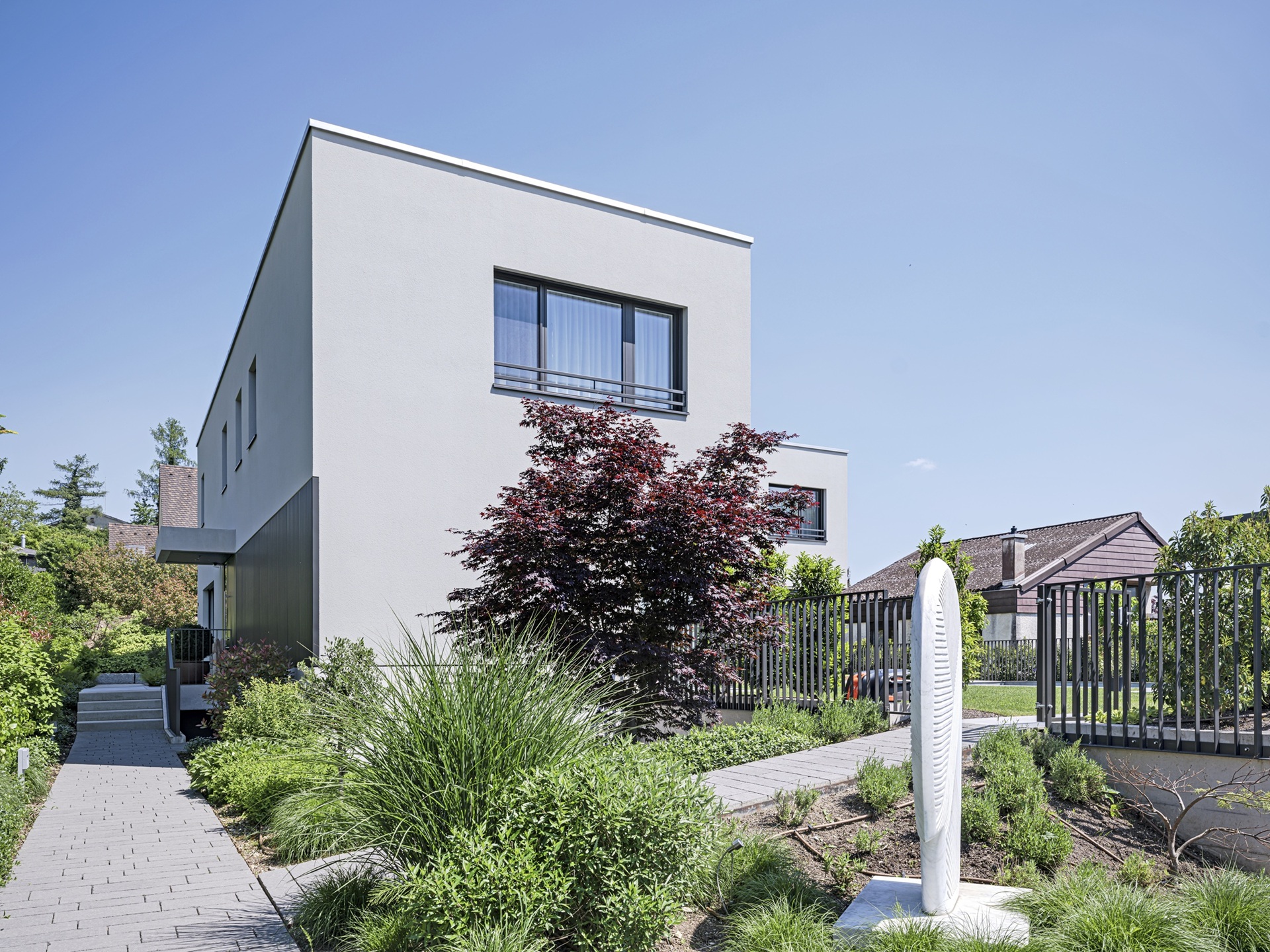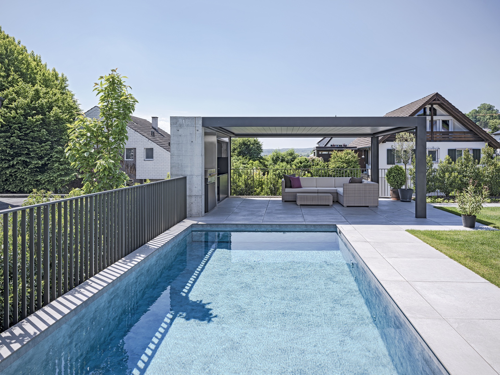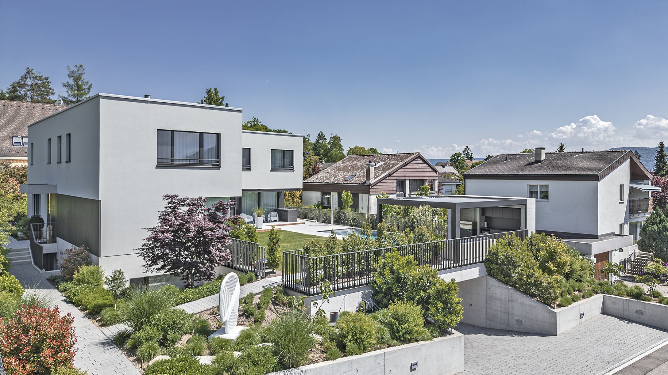 Der L-förmige Grundriss des Neubaus umarmt einen grosszügigen, unterbauten Gartenraum mit Pool, einer Pergola mit Freiluftküche und ausreichend Aufenthaltsfläche. Grossformatige Schrittplatten führen um das Gebäude zu einem intimeren Sitzplatz hinter dem Haus. Die Grünflächen entlang der Parzellengrenze sind artenreich und vielfältig gestaltet. Ein Heckenkörper mit Portugiesischem Kirschlorbeer, sorgt für Sichtschutz gegen die Strasse.