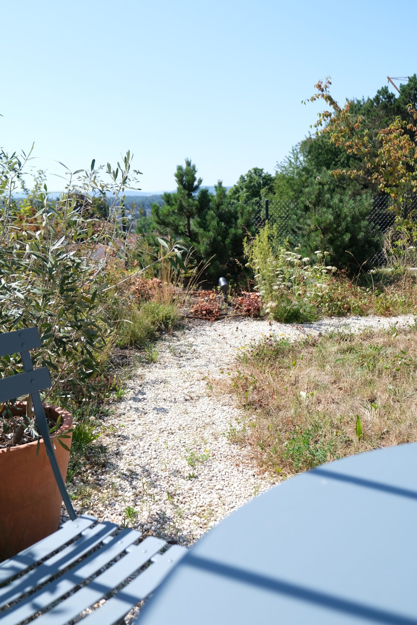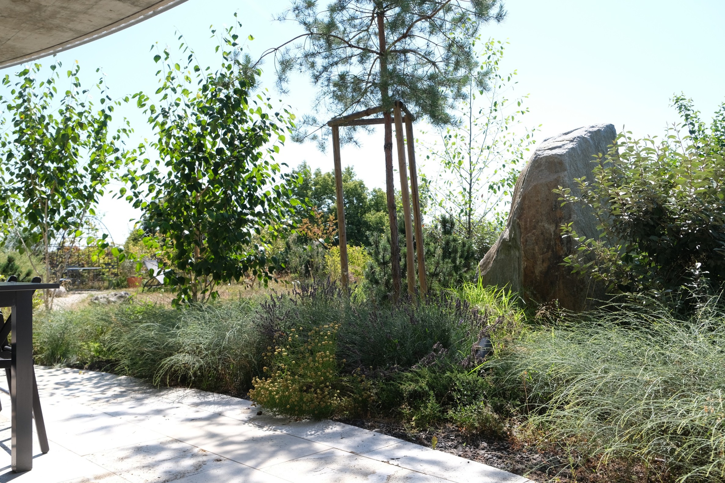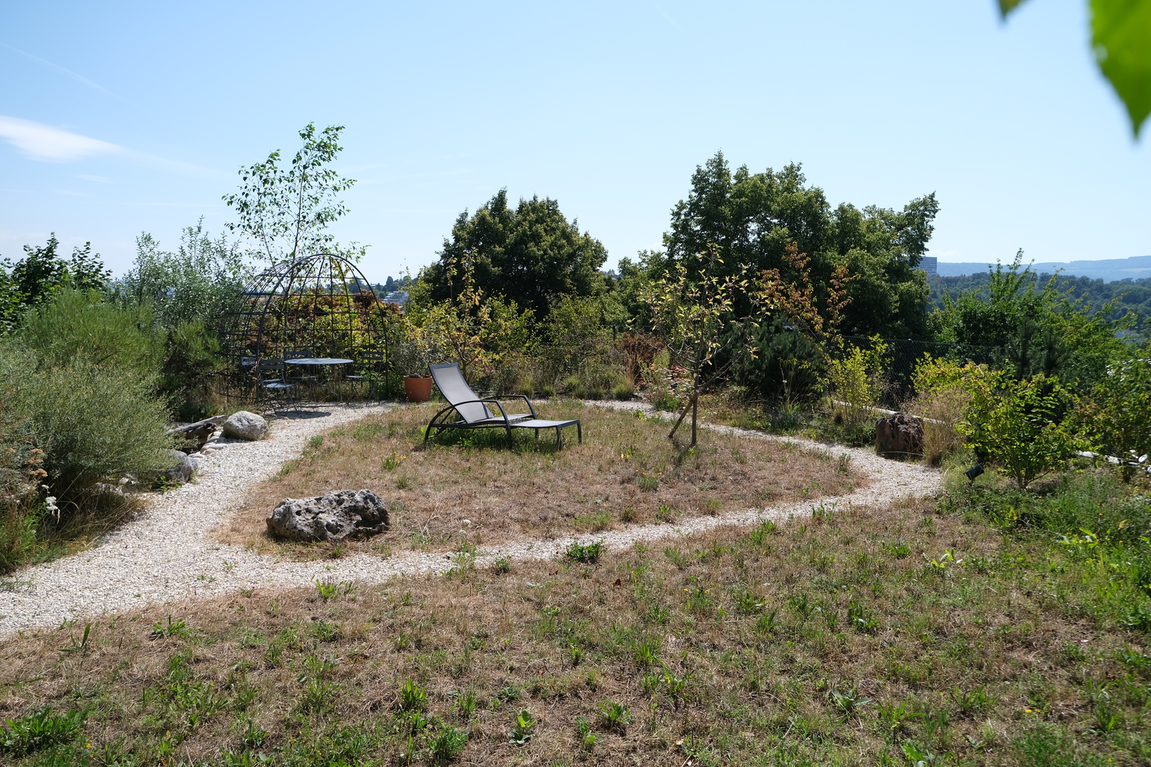 Ein intensiver Dachgarten mit wildem Charakter, in einem spannenden Dialog mit seiner Umgebung. Auf Wunsch der Bauherrschaft wurde dieser Garten, nach den Prinzipien des Feng Shui angelegt. In der chinesischen Harmonielehre, spielen die fünf Elemente (Holz, Feuer, Erde, Metall und Wasser) eine tragende Rolle. Der Garten wurde so konzipiert, dass die Lebensenergie „Chi“, in eine positive Richtung gelenkt wird. Dazu wurden bestimmte Gestaltungselemente wie ein kleiner Teich, ein Rosenpavillon, ein mehrere Tonnen schwerer Findling aber auch bestimmte Gehölze, ganz bewusst im Raum verortet.
