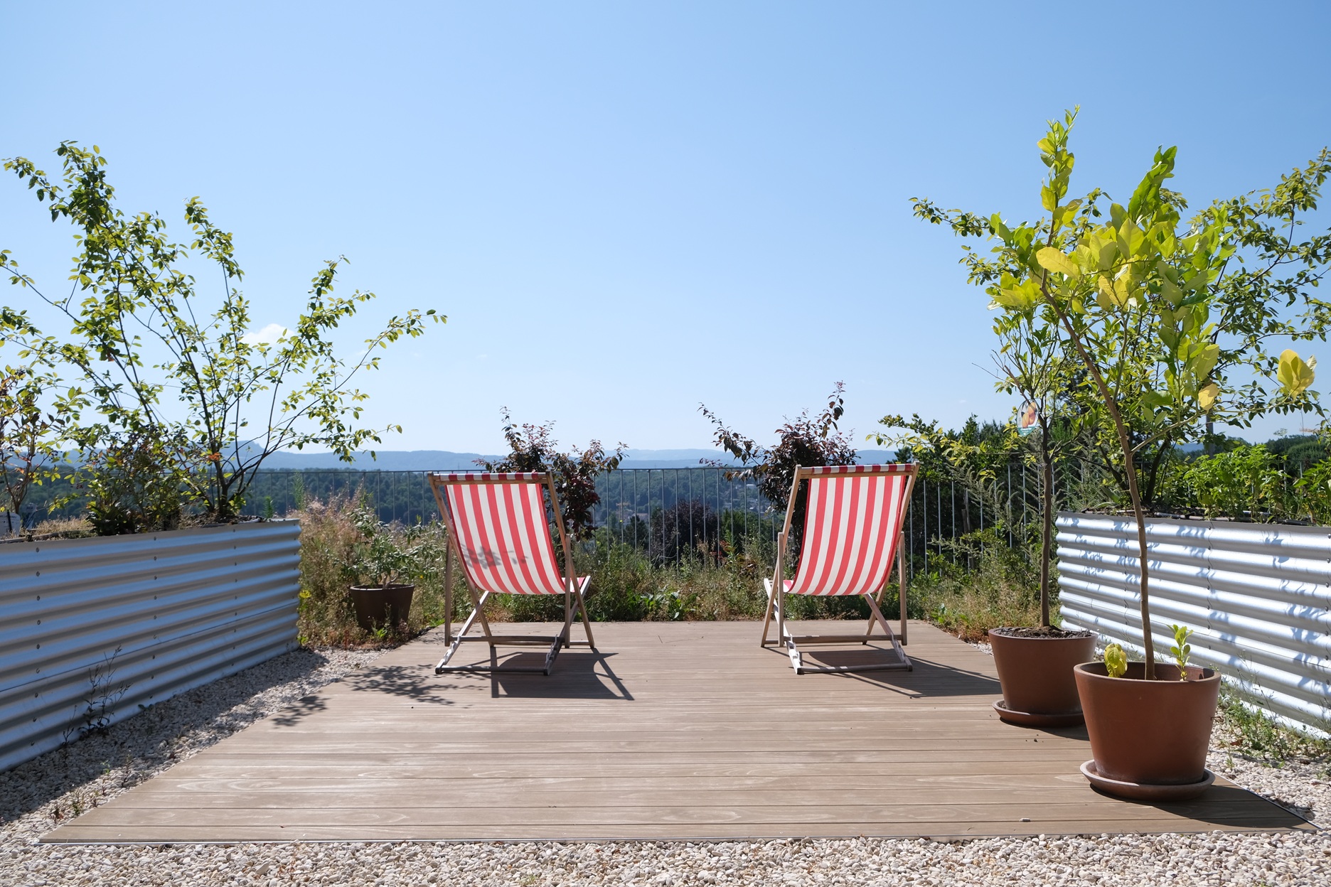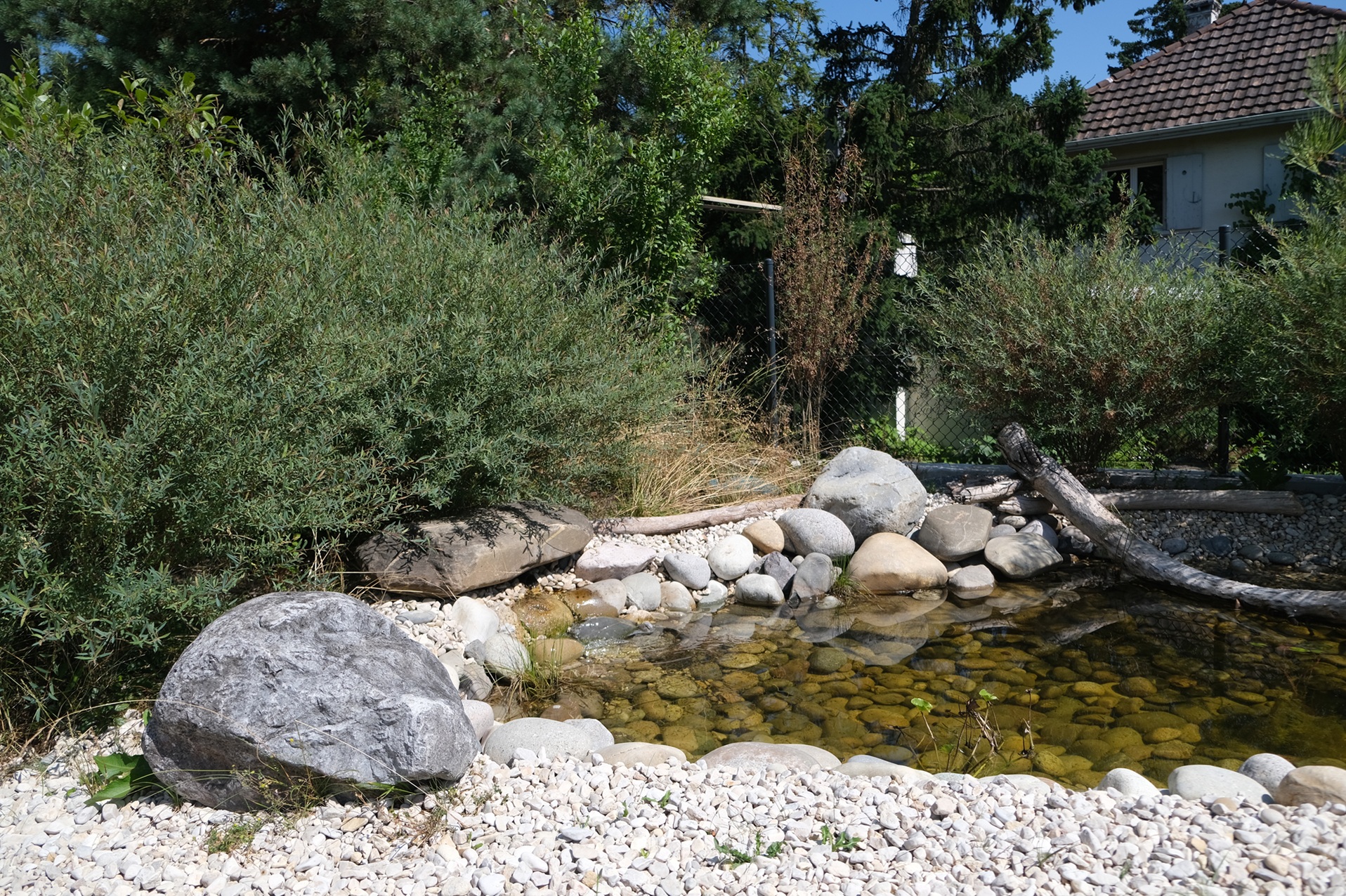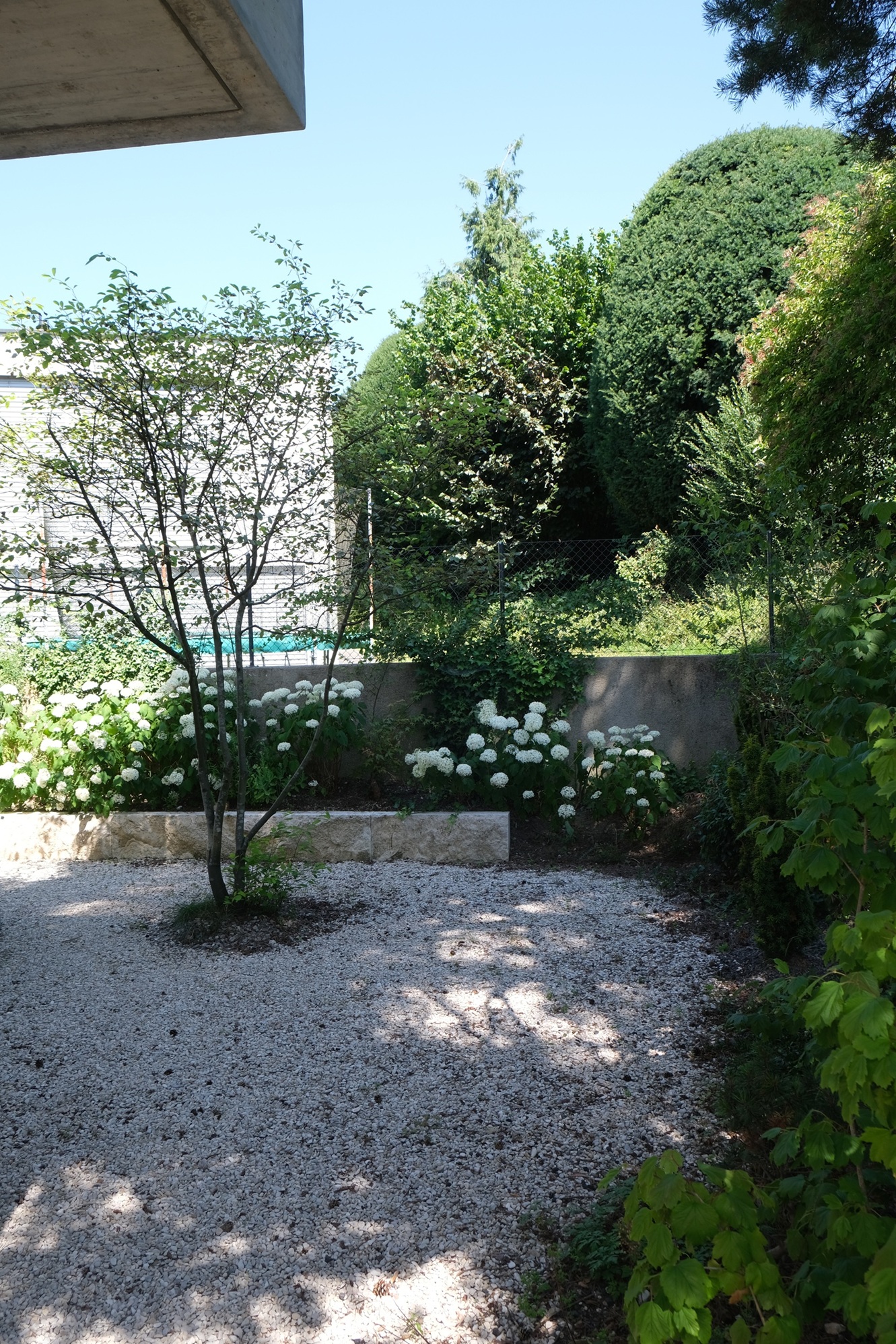 Ein intensiver Dachgarten mit wildem Charakter, in einem spannenden Dialog mit seiner Umgebung. Auf Wunsch der Bauherrschaft wurde dieser Garten, nach den Prinzipien des Feng Shui angelegt. In der chinesischen Harmonielehre, spielen die fünf Elemente (Holz, Feuer, Erde, Metall und Wasser) eine tragende Rolle. Der Garten wurde so konzipiert, dass die Lebensenergie „Chi“, in eine positive Richtung gelenkt wird. Dazu wurden bestimmte Gestaltungselemente wie ein kleiner Teich, ein Rosenpavillon, ein mehrere Tonnen schwerer Findling aber auch bestimmte Gehölze, ganz bewusst im Raum verortet.